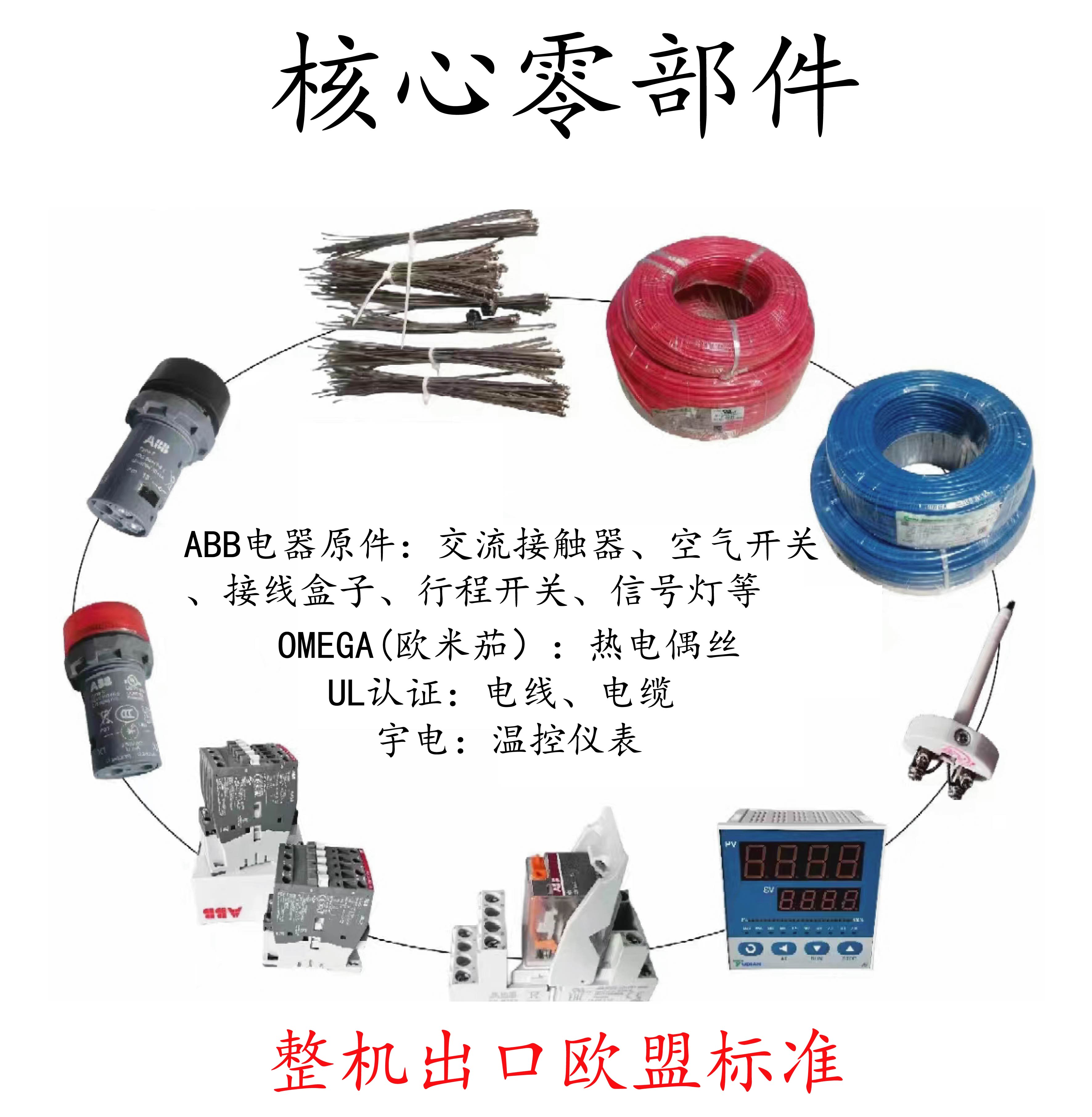 Ø认证标准及核心零部件:整机核心部件均符合CE、UL、MET等认证标准;核心零部件有ABB电器元件,UL认证电线、电缆,欧米茄,宇电、欧陆仪表等。