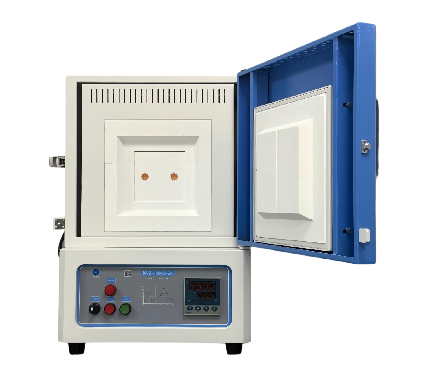 Ø炉体结构:采用双层壳体结构,并带有风冷系统;炉膛采用高纯氧化铝纤维材料,最大程度的减少能量损失;内炉膛表面涂有美国进口的高温氧化铝涂层,可以提高反射率及设备的加热效率,同时也可以延长仪器的使用寿命,带有过热和断偶保护;炉膛内两面加热,加热速率快,温场均匀;炉门配有安全限位开关,并且炉门上安装有一个保护门闩,防止意外开启及爆炸。