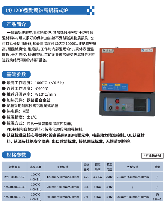 - GL72 型号炉膛尺寸为 300mm×400mm×600mm,加热空间 72L、额定功率 18kW,在 380V 额定电压下运行,外形尺寸 680mm×880mm×910mm,重量 120kg。